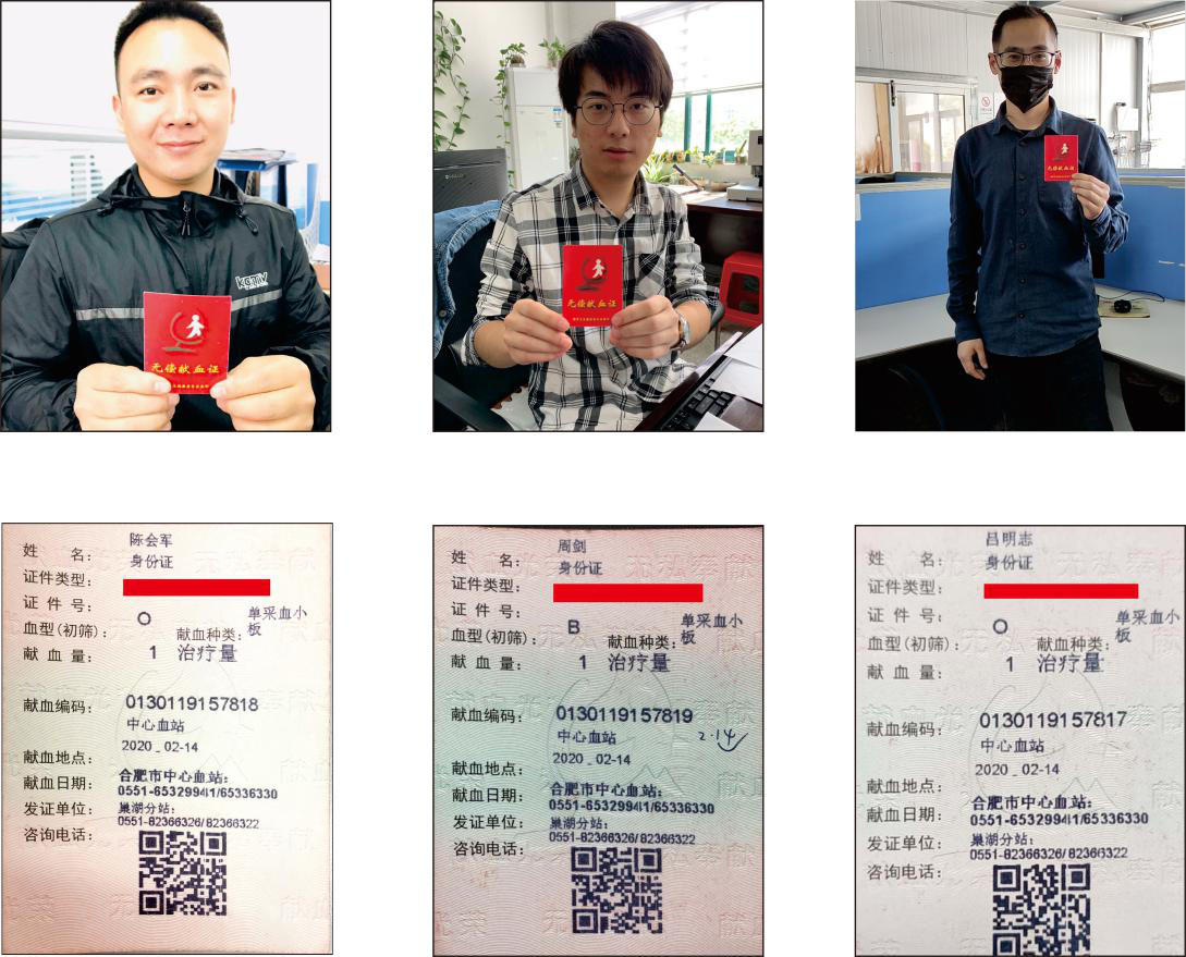 得知消息后,董事長鄭家明、總經理馬正源立即通過微信群號召符合條件的員工積極報名,施以援手,奉獻愛心。消息發出的時間是晚上九點左右,意想不到的是一石激起千層浪,大家積極響應,踴躍報名,出現許多感動時刻:魯梅、顧寧夫妻檔同時報名;機加工黃宏生自己的血液不符合條件,讓兒子頂替報名;生產供應部的李志武第二天得知消息后第一時間報名......不到一個小時,自愿報名人數達36人并且分成幾個批次獻血,安排周劍、陳會軍、呂明志、鐘晉生、左志5人于第二天上午前往合肥血站,其中周劍、陳會軍、呂明志獻血成功。